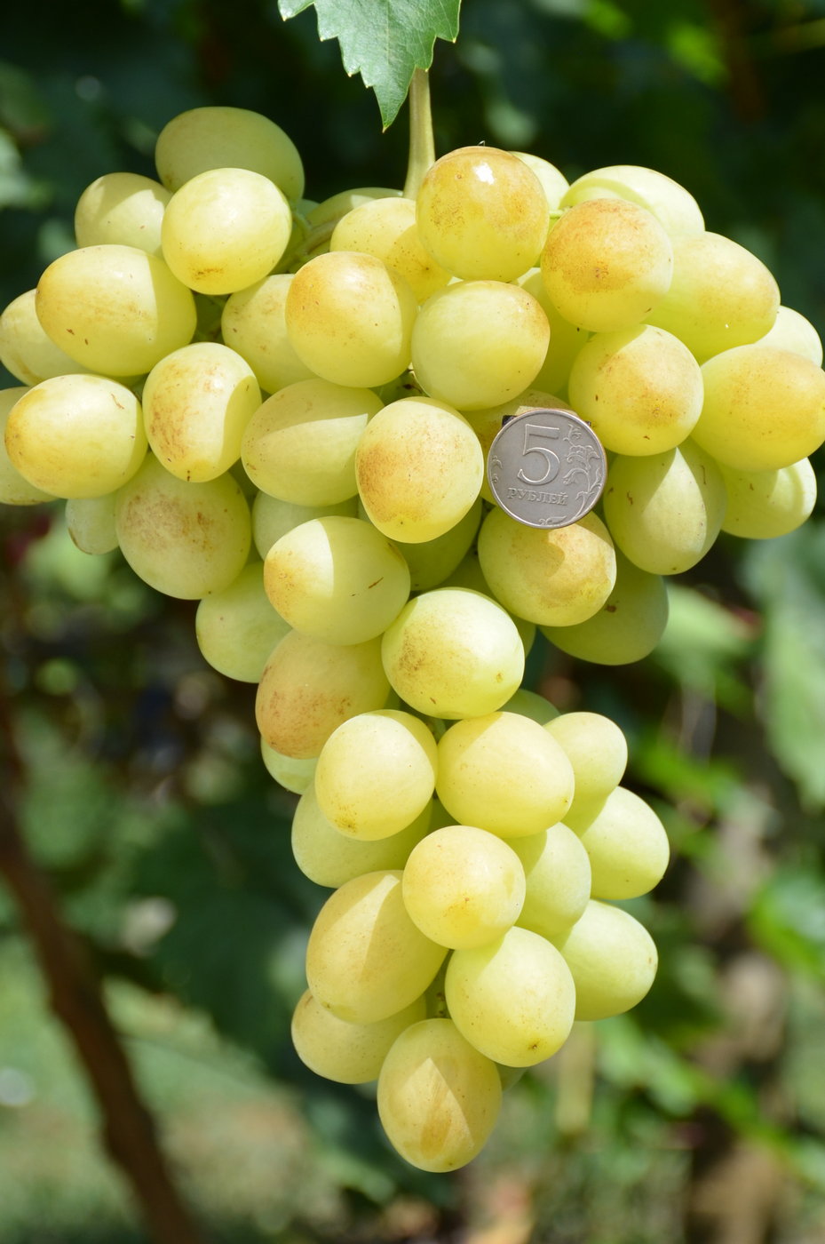 Ранний-110-115 дней. Сильнорослый. Урожайный. Цветок обоеполый. Грозди цилиндроконической формы, средней плотности, весом 700-1000 г., без горошения, привлекательного внешнего вида. Ягоды белые, округлой формы, средним весом 12-14 г., с легким мускатом, хорошо сохраняются на кустах после созревания. Мякоть мясистая, очень приятной консистенции, кожица при еде не заметна. Сахаронакопление высокое. Растрескивание ягод после сильных дождей не наблюдалось. Вызревание побегов хорошее. Обрезка на плодоношение на 4-6 глазков. Морозоустойчивость -22°С. Устойчивость к основным болезням средняя.