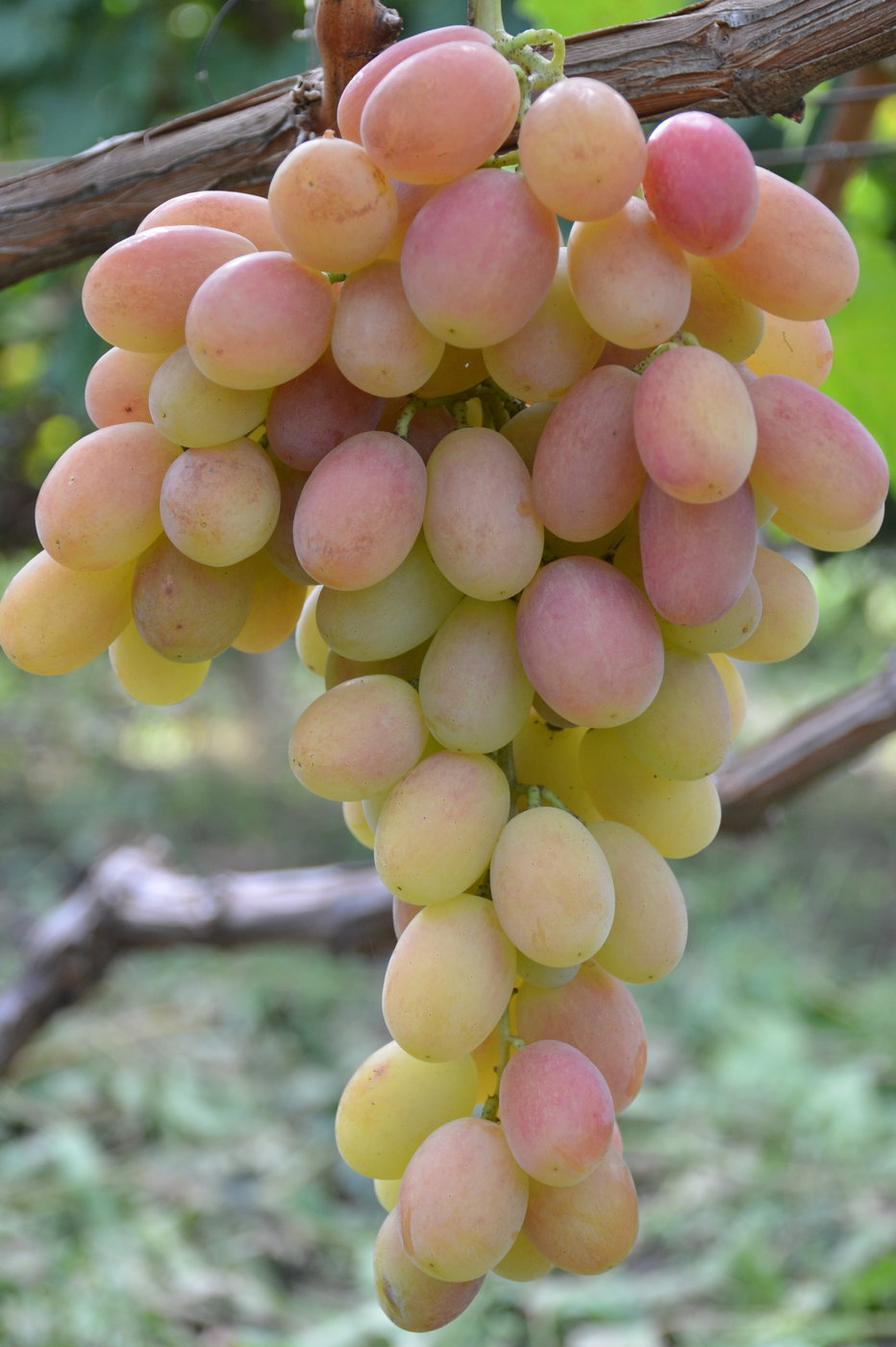 Селекция-Россия (Калугин В.М.). Срок созревания средний — 130-140 дней. Сильнорослый. Урожайный. Цветок ФЖ. Грозди конической формы, средней плотности, весом 700-1200г. (до 1,5кг), без горошения, привлекательного внешнего вида. Ягоды розово-красные, овальной формы, средним весом 18-20 грамм, очень приятного вкуса с легким мускатом, хорошо сохраняются на кустах после созревания. Мякоть мясистая, приятной консистенции, кожица съедаемая. Сахаронакопление высокое. Растрескивание ягод после сильных дождей не наблюдалось. Вызревание побегов хорошее. Обрезка на плодоношение на 4-6 глазков. Морозоустойчивость -22°С. Устойчивость к основным болезням средняя. Очень перспективный.